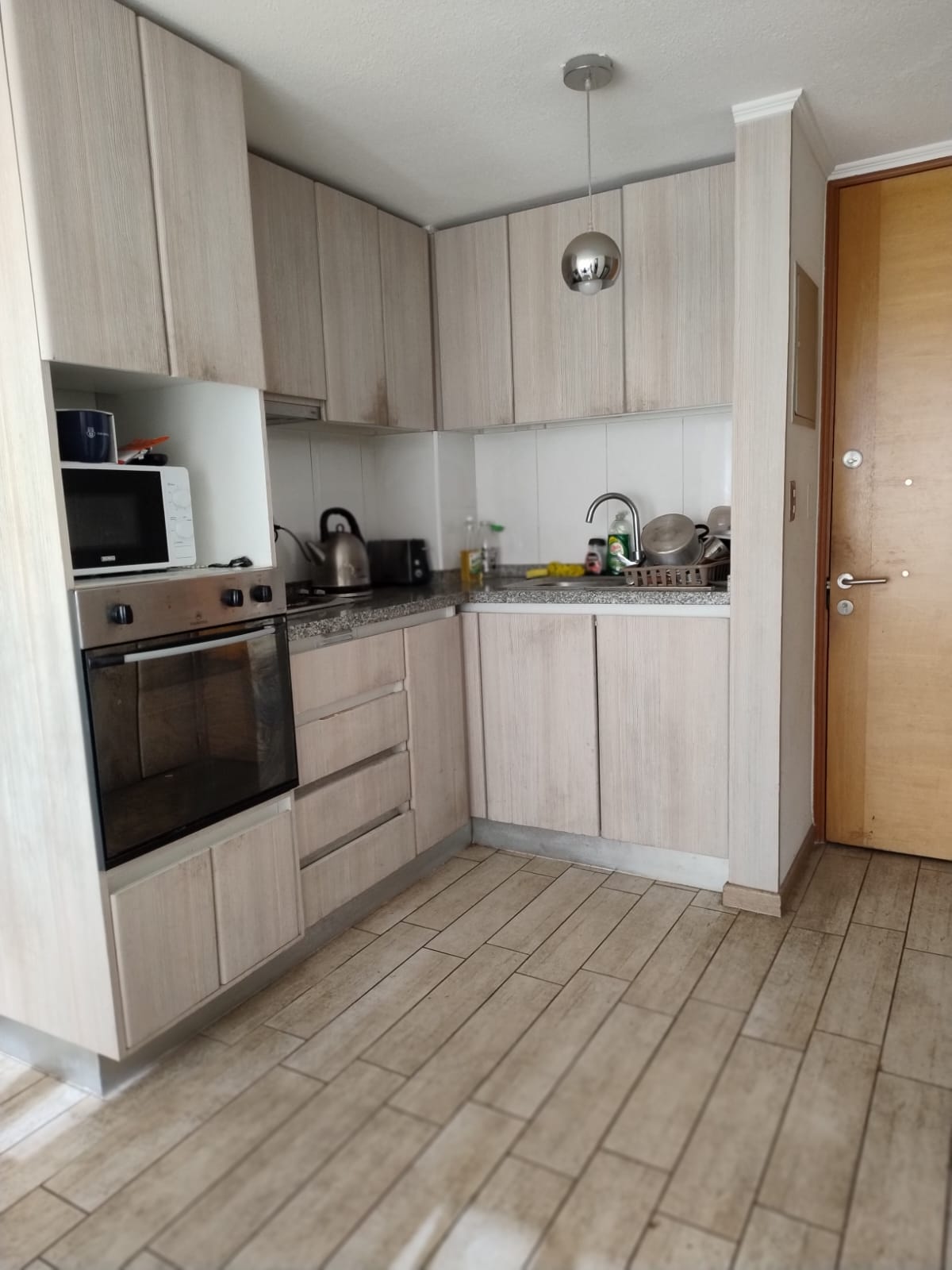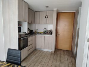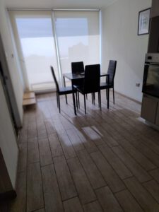 Departamento con una superficie total y útil de 48 m², ideal para quienes buscan un espacio práctico. El área principal integra living-comedor junto a la cocina, en un ambiente conectado y funcional. La cocina cuenta con mobiliario de líneas rectas y almacenamiento superior e inferior, horno empotrado, y cubierta clara, aportando un estilo contemporáneo al espacio. El comedor, adyacente a amplios ventanales, favorece la entrada de luz natural y la conexión con el exterior. El departamento dispone de un dormitorio y un baño, el cual presenta revestimiento en tonos neutros y mueble lavamanos integrado con espacio de guardado. El baño se destaca por su diseño sobrio y funcionalidad, contando con espejo amplio y accesorios básicos. Se permite la tenencia de mascotas y no incluye bodega. La distribución y terminaciones del departamento permiten un uso eficiente de sus espacios, adaptándose a diferentes estilos de vida. El acceso principal está a la vista desde el área común y la disposición general genera ambientes cómodos para su tamaño. Gastos comunes 45.000 pesos aproximadamente.